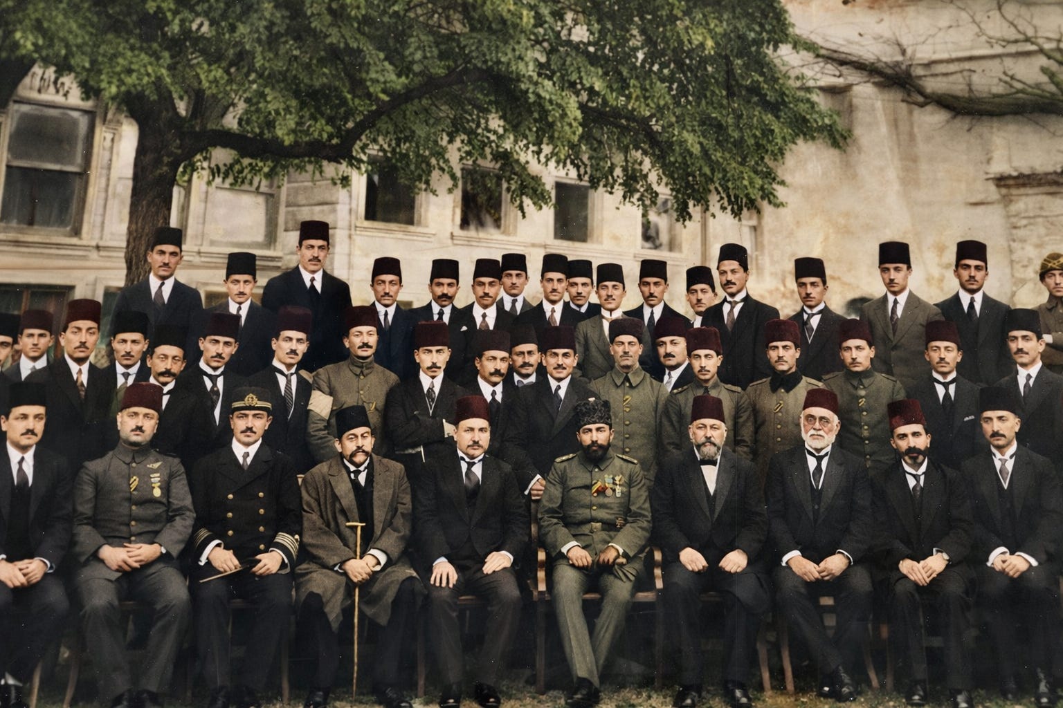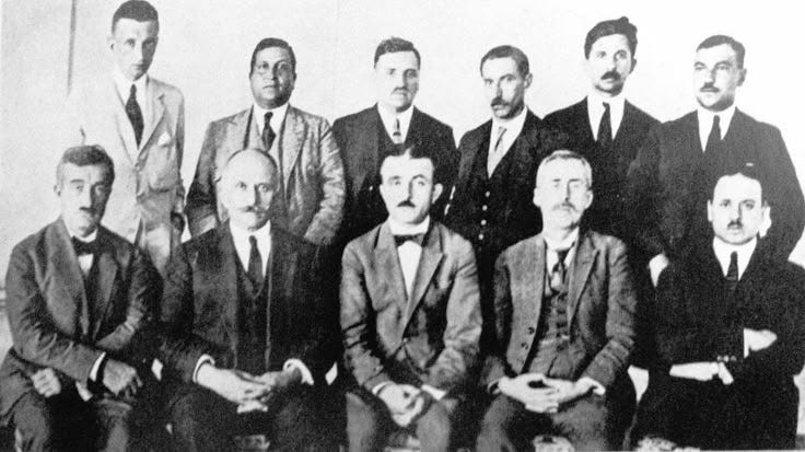 1914 senesinde Türk Ocağı’nda çekilen resimde yer alanlar: Yahya Kemal, Ali Fuad Paşa, Rauf Orbay, Yusuf Akçura, Ziya Gökalp, Cemal Paşa, Mehmed Emin Yurdakul.